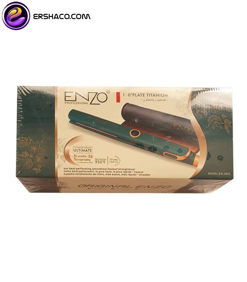 اتو مو و حالت دهنده انزو پروفیشینال Enzo Professional EN-3824 دارای قدرت 3000 وات برای حالت دهی سریع مو است.اتو مو انزو EN-3824 دارای صفحه سرامیکی با پوشش تیتانیوم است که گستره دمای 480 تا 950 درجه  فارنهایت را ارائه می دهد و شما می توانید این گستره دمایی را با صفحه نمایش LCD  ببینید.اتو مو  Enzo Professional EN-3824 مناسب برای موهای کراتینه و پروتیئنه است و دارا ی3 متر سیم با چرخش 360 درجه می باشد.