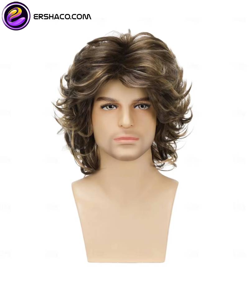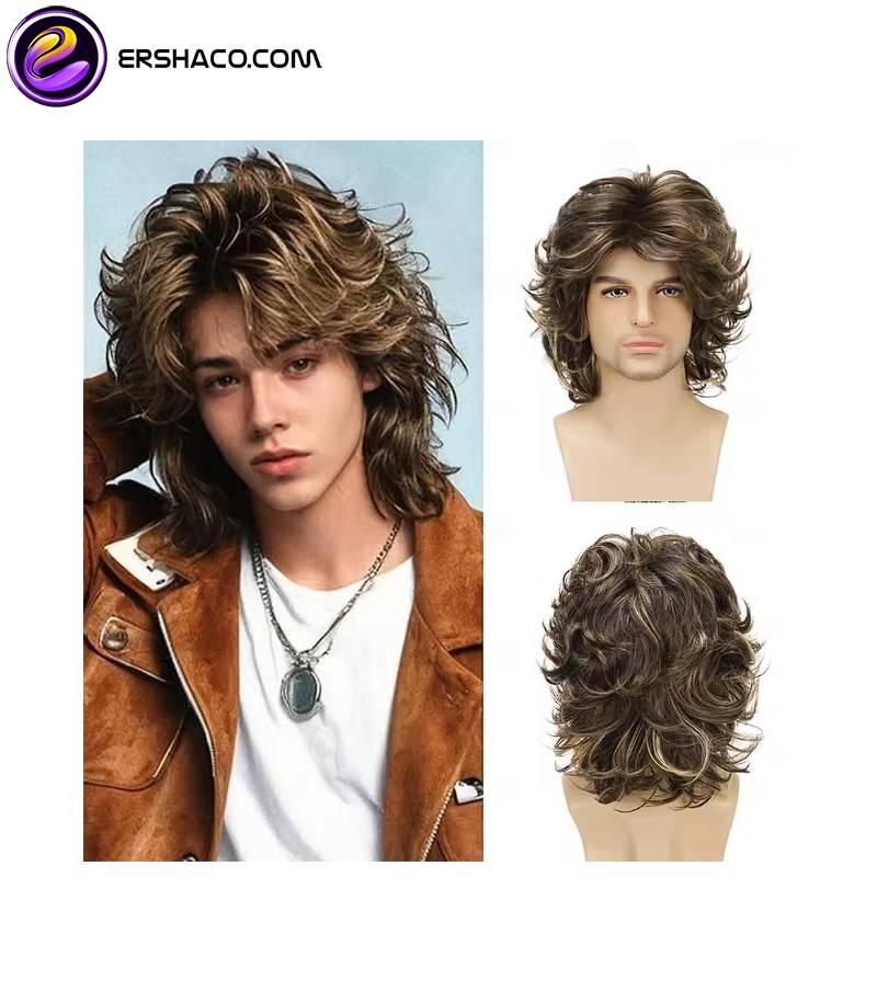 کلاه گیس مردانه موی مصنوعی ، دهه 80،رنگ قهوهای ترکیبی با بلوند موجدار است که کلاه گیس مناسب مهمانی راکر، لباس هالووین می باشد.