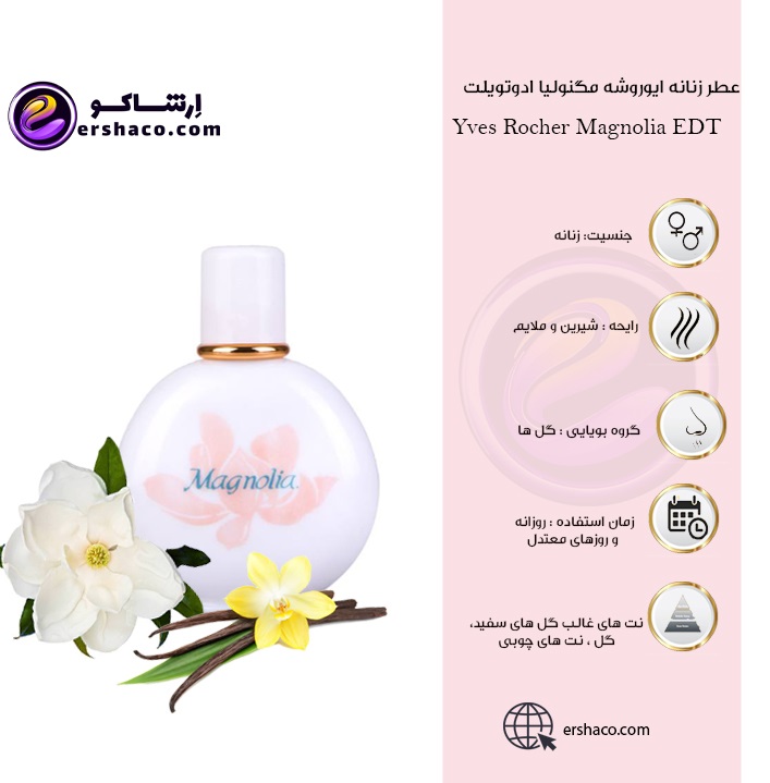 عطر و ادکلن زنانه ایوروشه مگنولیا Yves Rocher Magnolia EDT for women عطریست جذاب , لطیف و خاص و کلاسیک که از قدیمی ترین محصولات کمپانی ایو روشه بوده و در سال 1983 طراحی و روانه بازار شد,